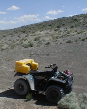 I did succumb to peer pressure and purchase the matching front box from Tamarack. It beats using seventeen bungee cords to tie down my canteens and such, not to mention the aerodynamic element that it affords my quad. I'm not thrilled with the mounting, though- two giant bungee cords around the handles- so I may have to come up with something a bit more elegant. 2 July 2003 Added some comments regarding the Wheel Of Mystery which we found at Omco. Flag Day 2003 I redid the text list of sites because it was getting unwieldy. I was going to use some java-based drop down boxes but I just couldn't find one that I liked- so, it's HTML for now. 11 June 2003 There's talk of returning to the Gabbs area next trip to see Quartz Mountain and Broken Hills, and then sliding down past Omco to see Simon, which we came tantalizingly close to last time by taking a wrong turn. Instead, we turned around so we could see Antone Station, which we never did find, and which also had a dead cow. Circling around the desert looking for traces of foundations while the smell of 800 pounds of rotting hamburger fills the air tends to reduce your exploratorial desires. Someone asked me why we didn't go to Broken Hills and Quartz Mountain first, since they were more established camps. That's because we're explorers, not tourists. We don't go after the sure thing. We don't take the easy route. I just had an idea. I think I'll add what we had for dinner to each page. It is, after all, a big part of our trip. Check out my new case- it's a hard polyethylene case made by Tamarack and so far it has proven to be far superior to the soft cases I've used- and thrown away. You should consider getting yourself one, even if you don't have any ATV. 9 June 2003 OK, I completely redid the entire site selection map-choosing-thingie and have probably screwed everything up beyond repair. But since hardly anyone actually reads this news letter, no one will ever know what happened. But at least now there are only four maps to choose from instead of six or eight, and of course the best improvement is that each and every site is represented by a tasty piece of candy corn, which has been made since the 1880's. Speaking of 1880's, I was speaking to someone at the Phone Company and I asked her if she remembers when there was only one Phone Company, and when you got a long distance call it was a big deal, and people would say, "Telephone! It's Long Distance!" She didn't. Anyway, we added Atwood, Goldyke, and Pactolus (all in Nye County) and Omco (Mineral County) to the lineup. 5 June 2003 OK, the whole choose-a-site-by-clicking-on-the-map deal has gotten completely out of hand, now that Luis has insisted on visiting sites in other counties. Yes, it's all his fault. So look for a new map-choosing-thingie coming soon, and also some photographs on the sites we visited in Nye and Mineral Counties over this weekend. Yes, Mineral County. 4 June 2003 Now it looks like I'm back in the Ghost Town Web Ring, even without the picture. Of course, I can't tell if I'm corresponding with a 'bot or a person. I was pruning my Russian Olive trees yesterday afternoon without gloves- like an idiot- and I got one of those stupid thorns in my finger which felt like it went all the way into the bone. Fortunately, the swelling has gone down enough to ride Saturday. 3 June 2003 Decided to add an actual page for Pershing County, and some day neighboring counties as well, just because it seemed neater to do it that way. Looks like Luis wants to head south to Nye County this weekend, to check out things in the Gabbs area, before it gets too hot, so look for a report when we get back. 2 June 2003 600 unique and wonderful visitors have come to this web site. Some of them even arrived on purpose. 1 June 2003 Ah, the summer riding season is upon us. On our last trip my odometer turned over 1000 miles, most of those miles right in good old Churchill County. This will be the last year for riding on this set of tires, I'm afraid, they're starting to get a bit thin. I'm on my third box; hopefully this one will last through a few riding seasons. Luis is welding me up a rack which will extend from my present rear rack, to hold gasoline and perhaps a rock specimen or two, so that should be handy. Looks like our next trip will be to the Jessup area- I don't know if we'll have what it takes to go from there to Nightingale on the same day, but you never know. 31 May 2003 OK, the stitches have taken hold and it looks like we're going to take a nice easy trip to the Jessup area possibly around the 7th of June, before it gets too beastly hot up there. Stay tuned. 25 May 2003 Because I'm bored out of my skull, I added a little thingie to the Main Page that discovers where you are from and gives a silly greeting. It's somewhat reliable. 15 May 2003 Went out to the Dog Track today- look for a little blurb on that when I get around to it. No trips for a few weeks- I have to go into dry dock tomorrow and get some barnacles removed, so no bouncing up and down for two, maybe three weeks. Mother's Day 2003 Ove 500 unique visitors since February- and some of them actually arrived here on purpose! 10 May 2003 I added a "more pictures" page for the Desert Queen Mine since- for some odd reason- that page gets more hits than anything else. 8 May 2003 I just ordered a new "trunk" for my ATV, manufactured by