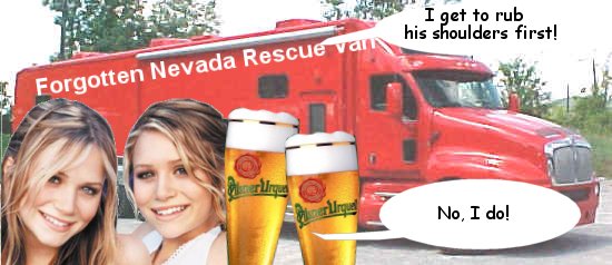Well it's the end of May and all I've really got done was fool with the web site and partially install my winch. The website redesign met with smashing reviews and thunderous applause (Thanks again, Mom) so I can leave that alone for a while. I've got my winch mounted [finally] but I'm hating the big ugly switch they're expecting me to use. I mean, what is the point of using a solenoid when I have to mount this honker? Of course, I could upgrade my winch to something that uses a normal rocker switch or even a remote control for only a $150 or so. Anyway. No trip this weekend or next, because the weather is just too pleasant and we need it to be miserably hot so we can whine about it. And I just ordered some K&N oil filters and I have to change the oil in the green beast and, of course, get the winch working. 29 May 2004 OK, the metamorphosis is complete; we've switched over from being a Churchill County-only website to a State of Nevada web site. Of course, most of the sites we document are in Churchill County, but what are ya gonna do? Boy I REALLY gotta start running the spell check before I post things. How come you people never say anything? We just joined a lot of web rings- which you can see on the links page- so that should bring in the exploring types and, with it- fame and fortune. Check out the latest trip to Masonic, Conway Stage Station, and Sonoma. 18 May 2004 OK, so, yeah, I changed everything around and maybe some things don't work, or maybe some things work better. At least it's different, and that, my friend, is what counts. I'm going to have to redo the maps because of Luis- that's right, it's Luis's fault for wanting to travel all over the freaking state, so my Churchill County-centered universe has now crumbled. I'm still going to have directions as coming from Fallon, just because. So for right now, you'll have to know the name of the place you want to visit and choose from the list of names. I'll be refining and changing other things as I find the time. 16 May 2004 OK, it's useless to try and pretend any more. We're not Historic Mining Camps etc. etc. of Churchill County. While there is still plenty for us to explore in Churchill County, and much of our exploration will be centered there and originate from there, it's plain to see that we're getting too many sites from outside the county to limit ourselves. Therefore, on this day, I hereby proclaim the new name of this site to be- Forgotten Nevada. I toyed with the idea of "Forgotten, Nevada" but I'd have to explain to someone that there is no town named "Forgotten." I thought it was a pretty good name, I Googled it, and I'm surprised no one has taken it. So, it's now ours. 14 May 2004 Lucky, lucky motorcyclebatteriesusa.com. My battery arrived and I just happened to be here to sign for it. On a brighter note, I have decided who the next James Bond should be. It came to me just last week, and the more I thought about it, the more I realized how right I am. He's a little old, but then all the actors who have played Bond are too old. Hold your monitor up to a mirror to see my pick, and then tell me how RIGHT I am.