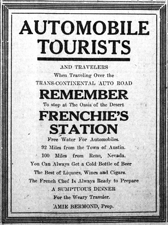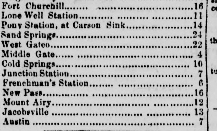 17 This table from the Marysville Daily Appeal, March 13, 1864, shows another "Frenchman's Station" 16 miles west of New Pass.
