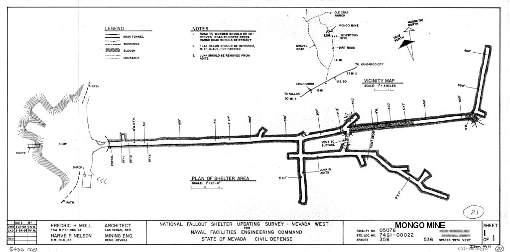 Your Government recognized this need back in the 1960's, and in 1969 they apparently remembered that Nevada is just chock full of deep holes perfect for hiding in. So they chose a few and mapped them just in case we needed 'em. It was part of the National Fallout Shelter Updating Survey, part of the Nevada West Naval Facilities Engineering Command, Civil Defense Department or Bureau or whatever they were.