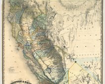 Full color by counties, with heavy outlines around the states. detail mining districts, political divisions, emigrant trails, the Santa Fe Trail, the Pony…