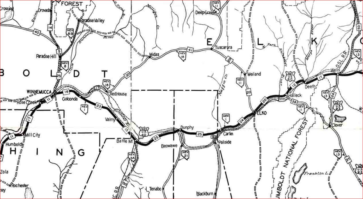 1934 State of Nevada road map showing Midas and its neighbor Tuscarora