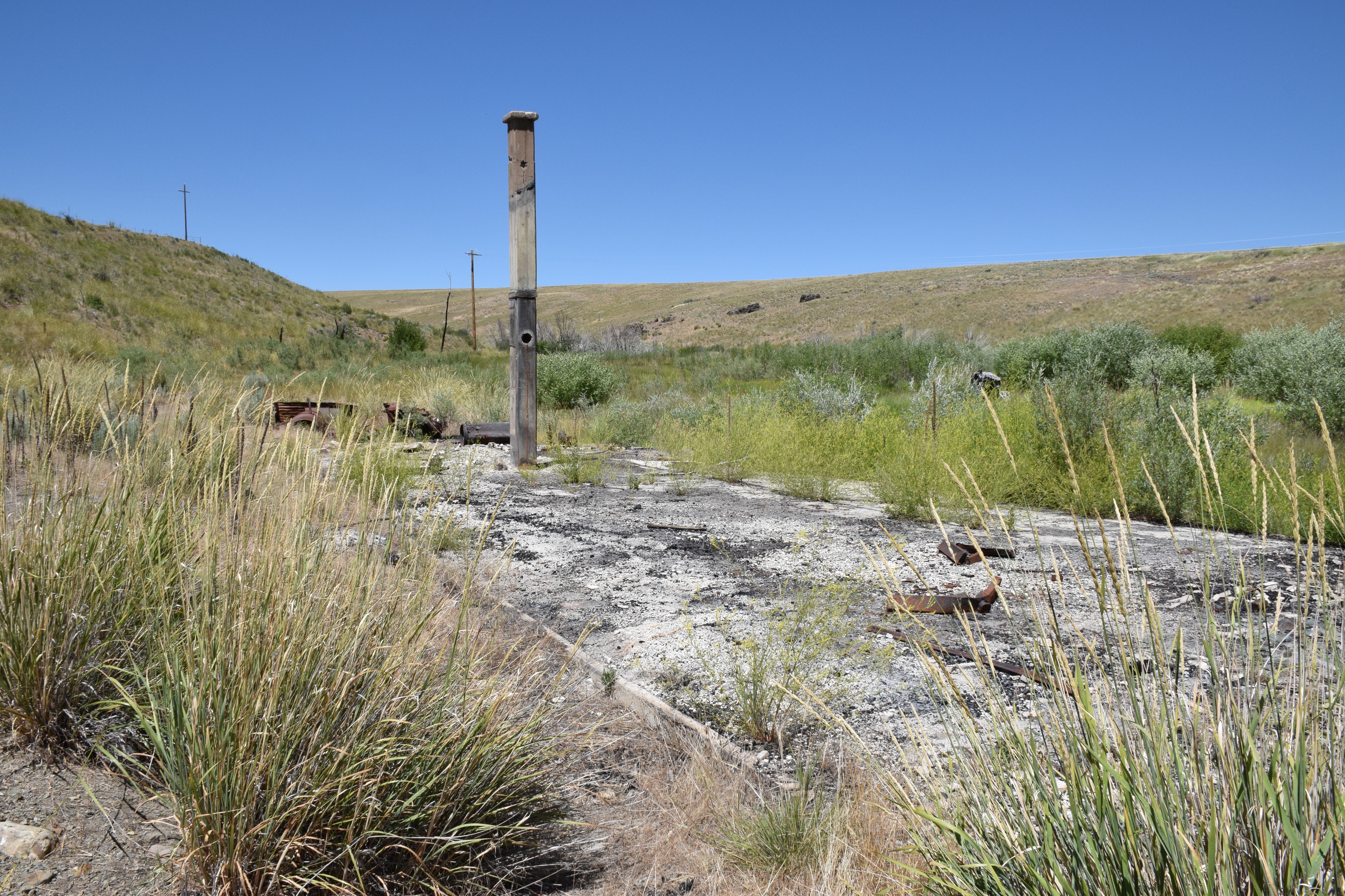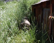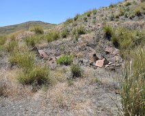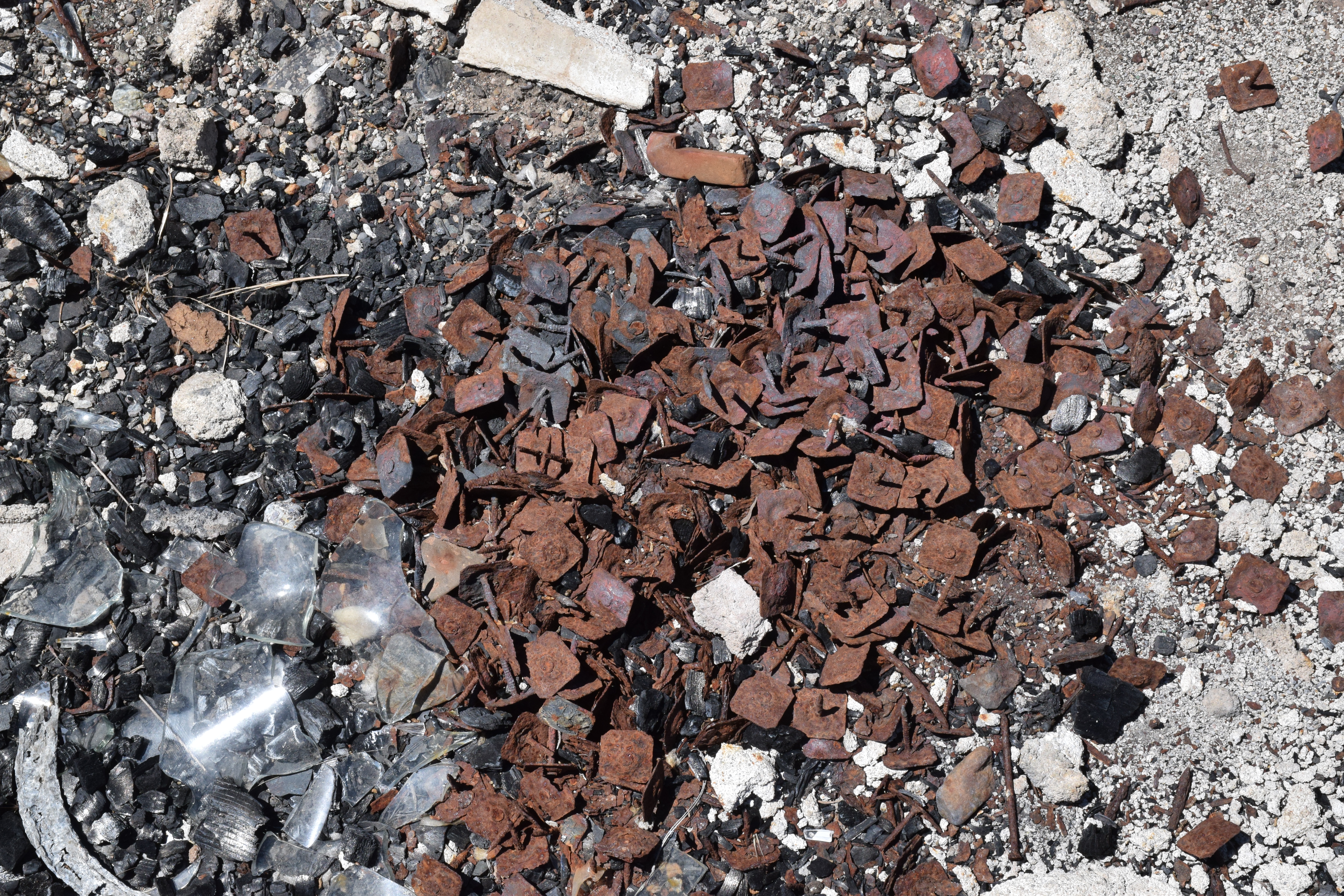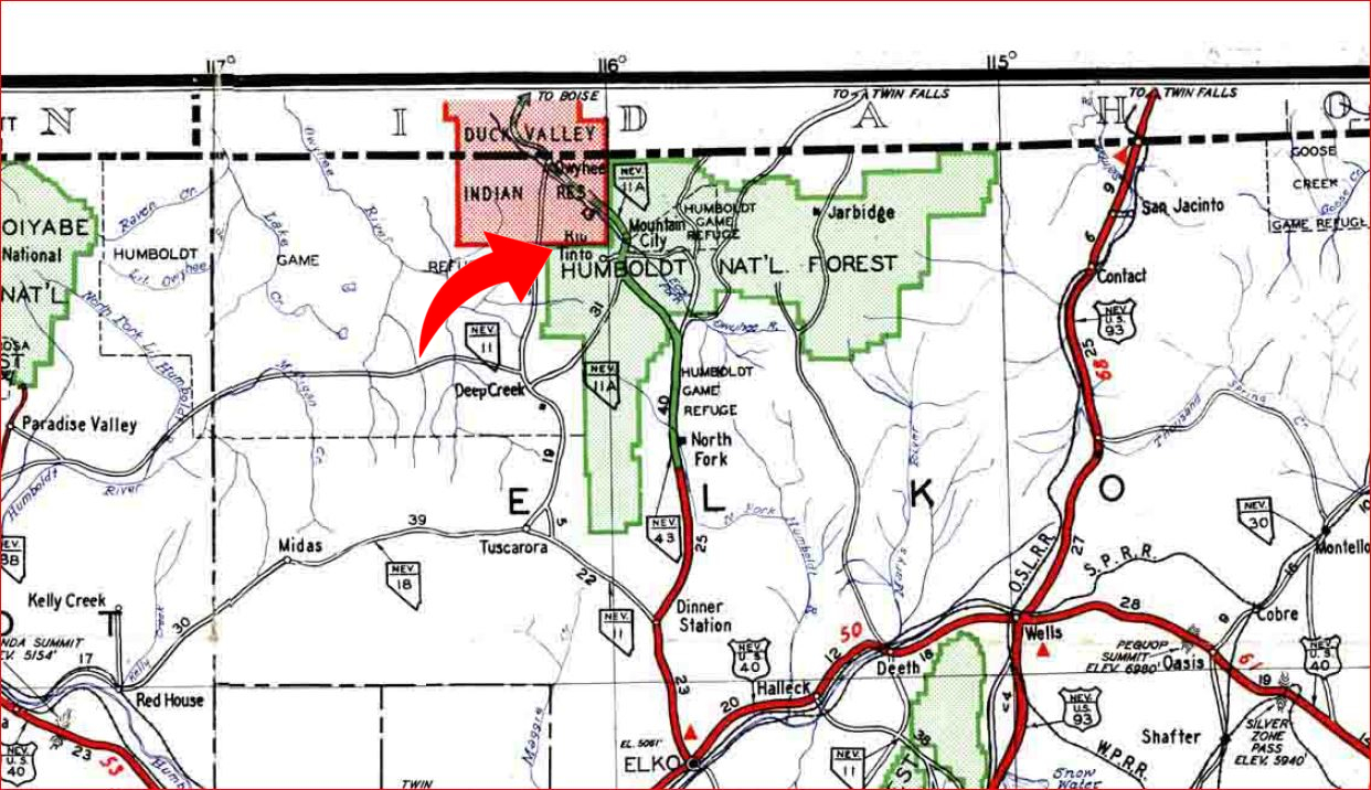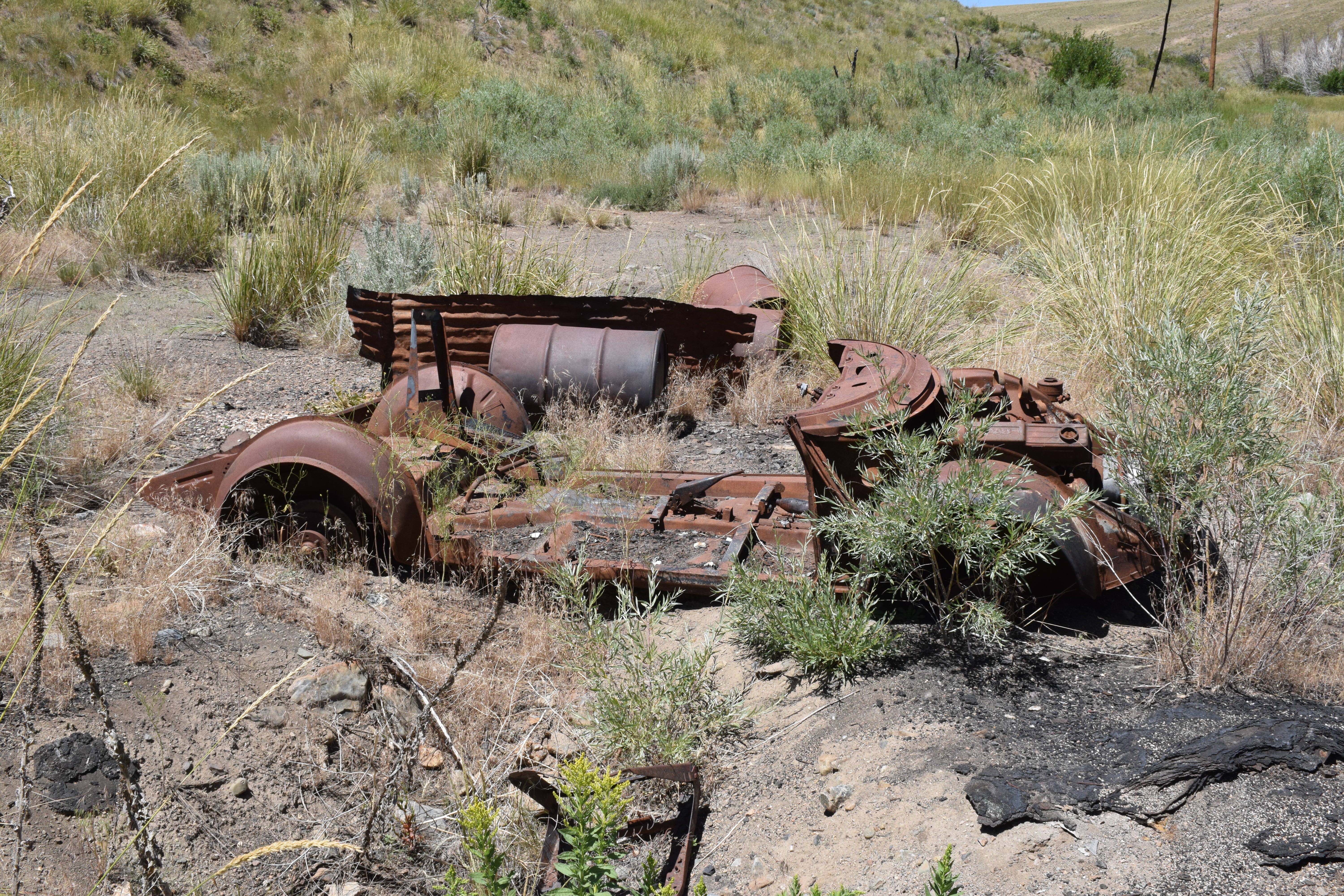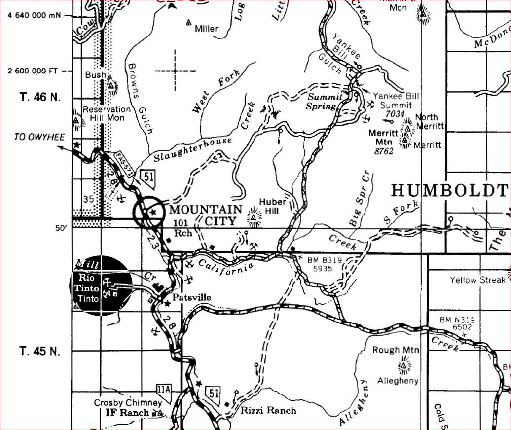 A 1936 USGS map with Rio Tinto highlighted and Patsville to the east A 1958 DOT historic quad showing Patsville, with Rio Tinto highlighted to the west By 1940, Patsville wasn't important enough to appear on a state road map The one remaining structure (that we could fine) on the east side of the highway On the west side of the highway, where most of the structures were, it appears a fire came through to burned everything down. The remains f someone's Saab
