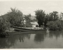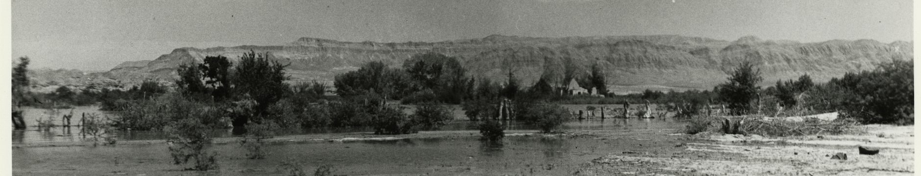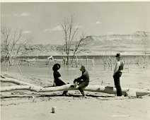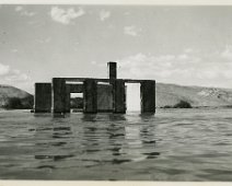 Salvage crew on a raft near the ruins of a building in the town of St. Thomas as Lake Mead submerges it. 1938 Courtesy UNLV
