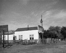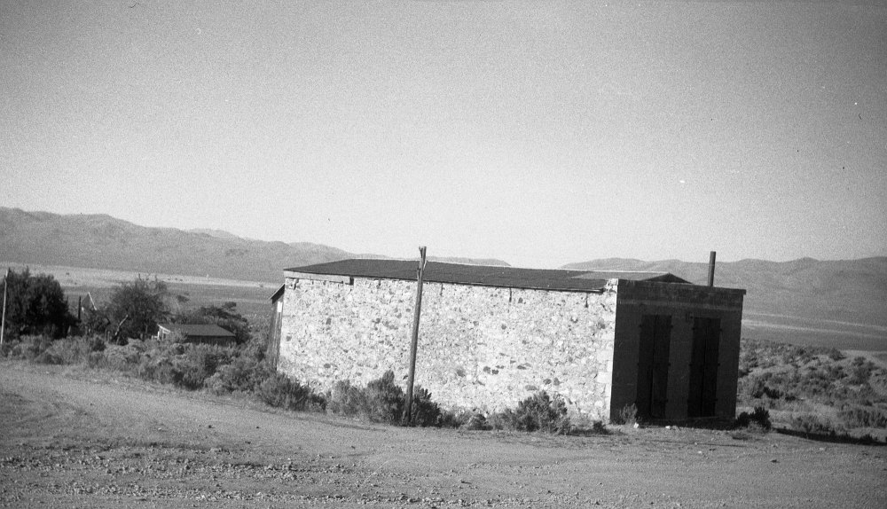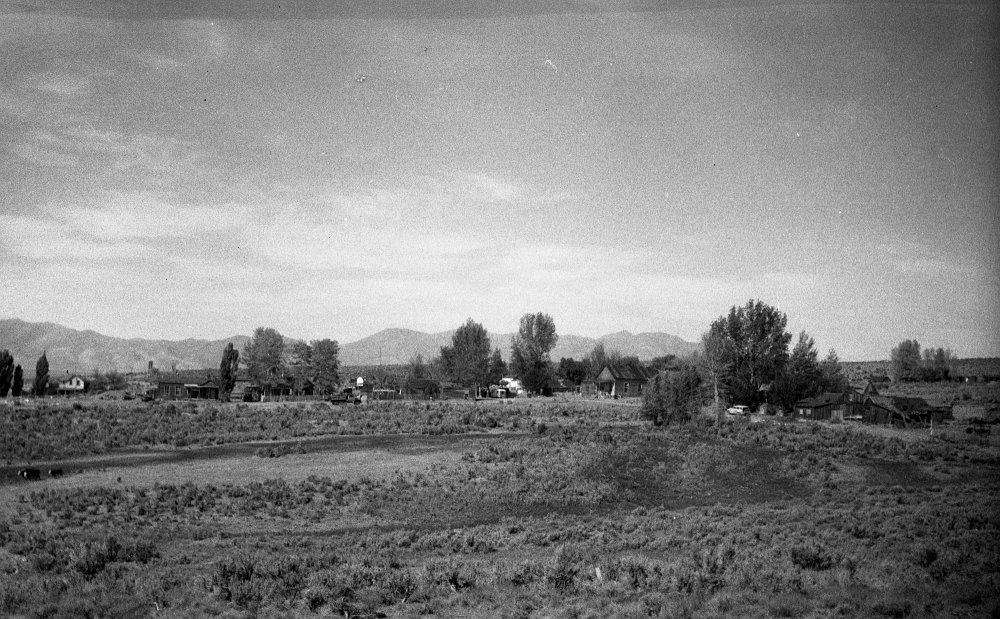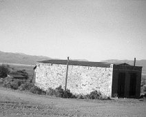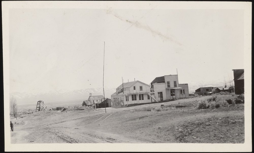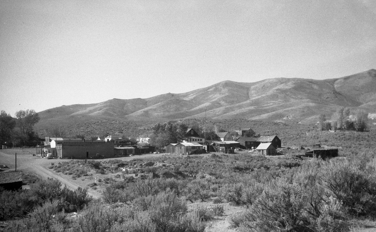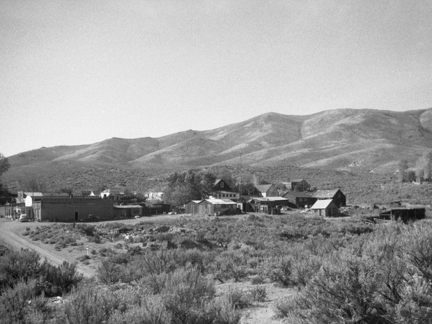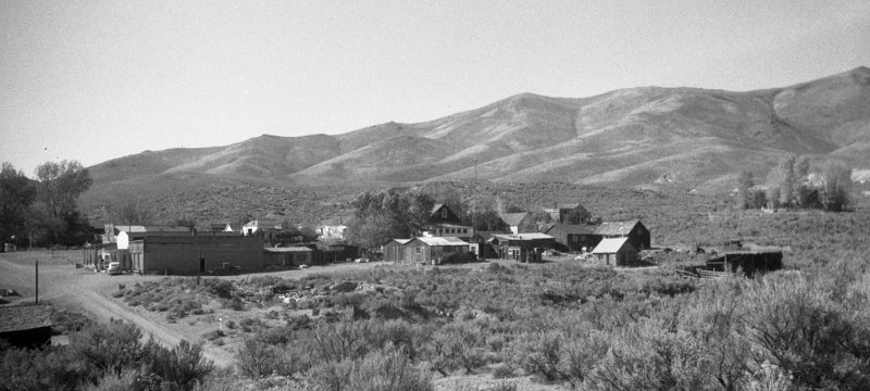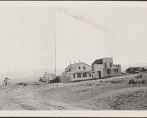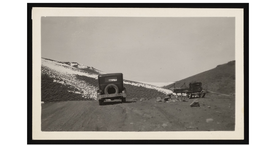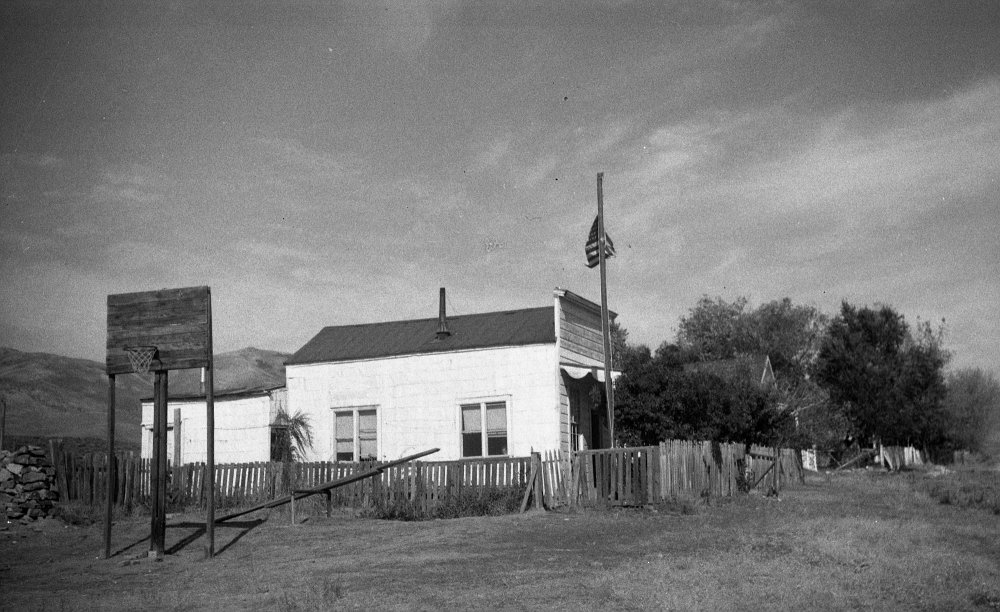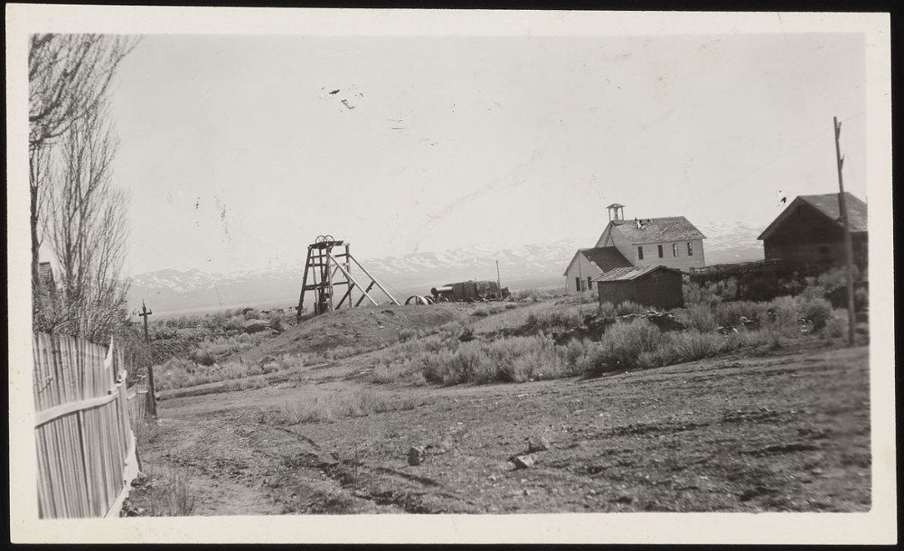 1906 Photo of a sage brush wagon for the Dexter mill, courtesy UNR. School building visible in background.