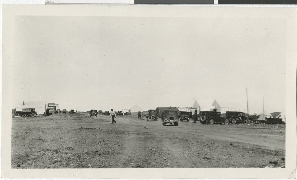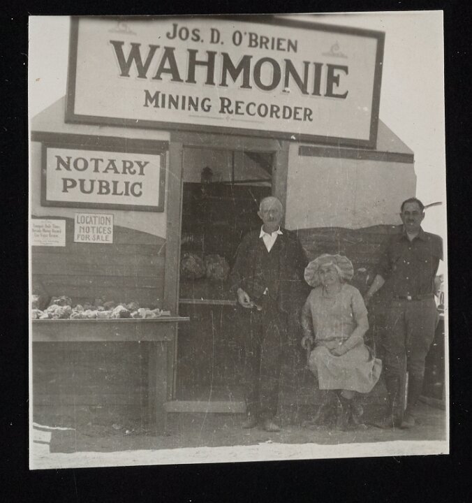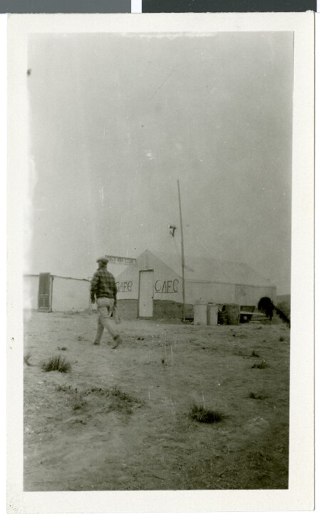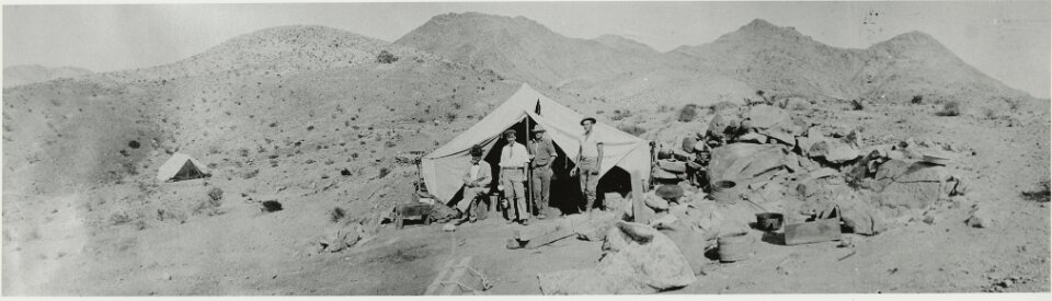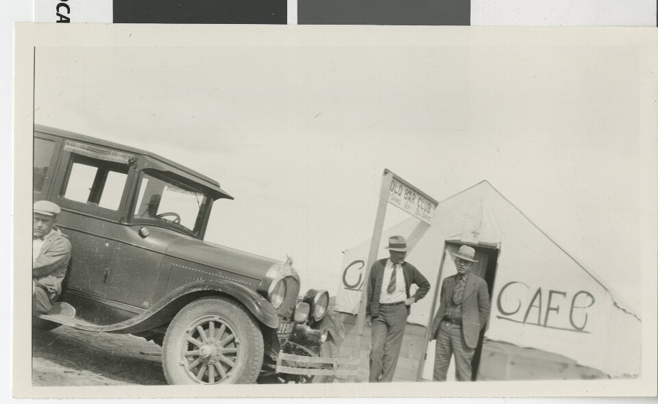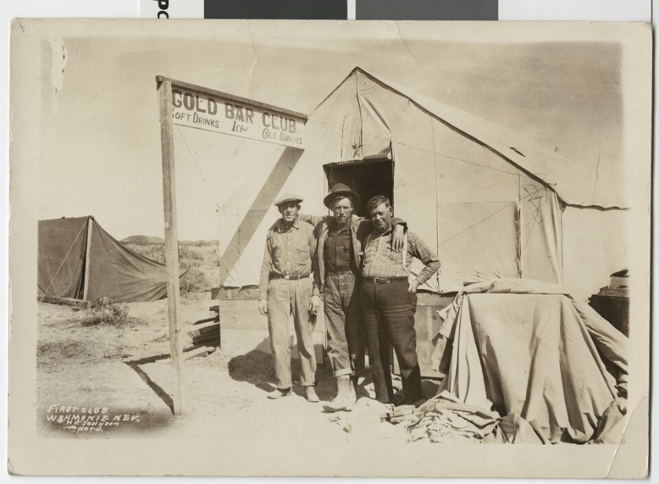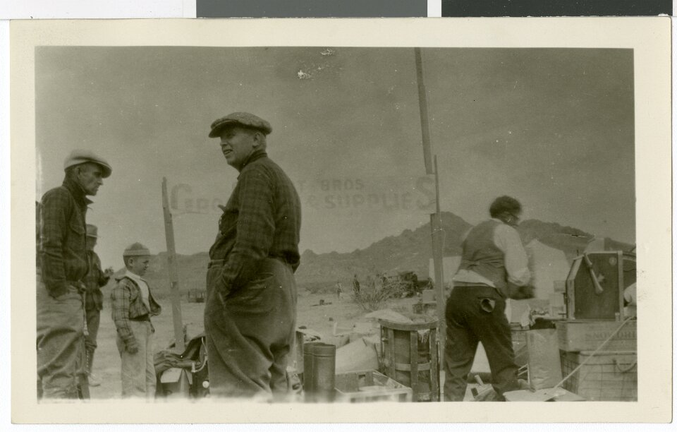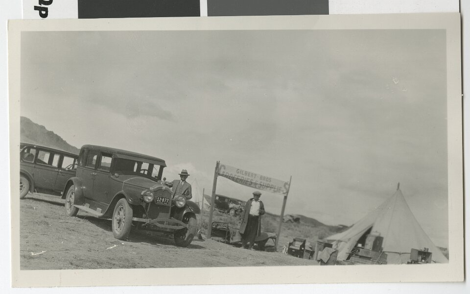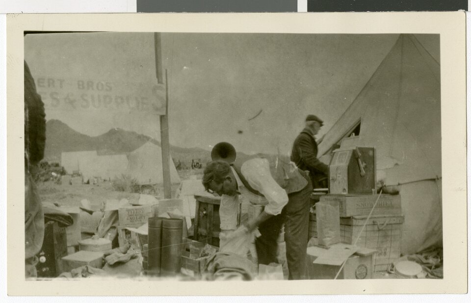 8 A makeshift store, showing Earl Rockwell, Leon Rockwell, Jr., and George Hanford. 1928 Courtesy UNLV