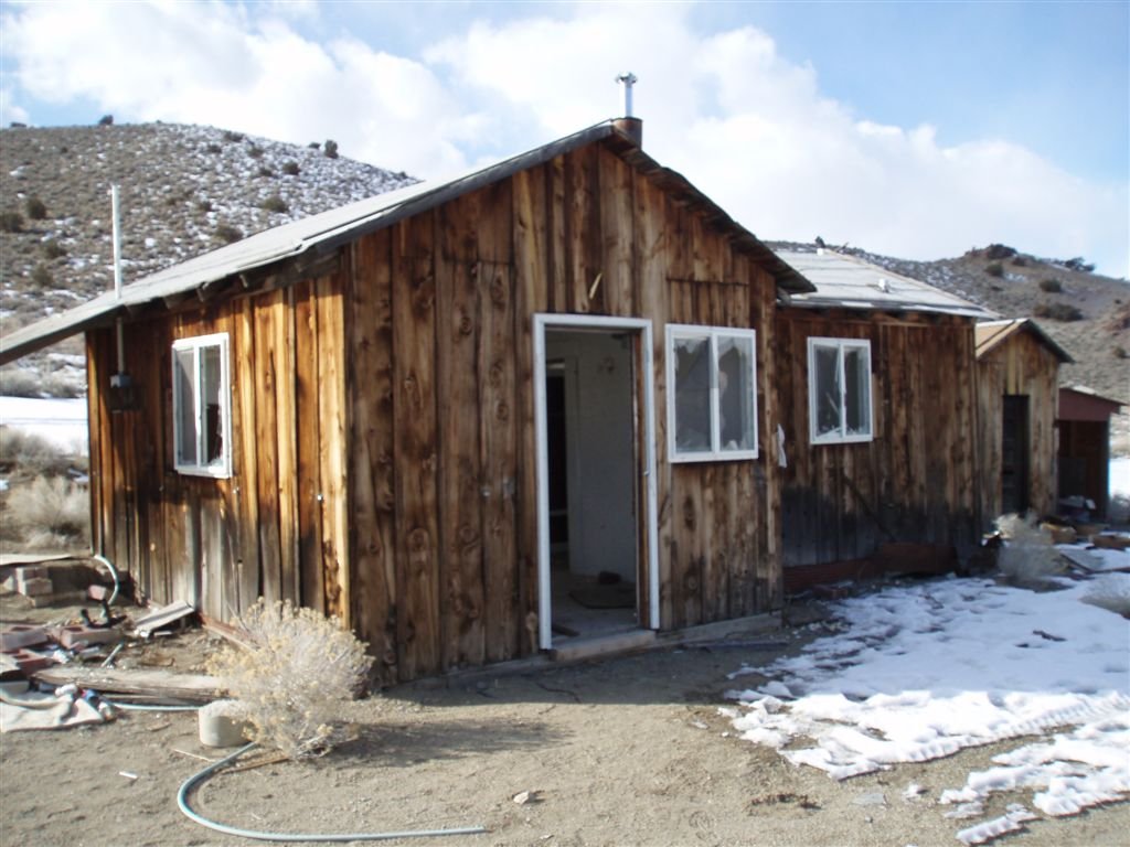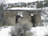 What is All that remains of the lower site is a wood frame building of obvious later vintage, a trailer, several neglected cars, and scattered debris. One can look at the site and visualize how it might have been laid out, however. There is also a grave, marked "Frank # Ondin," where the '#' represents an unrecognizable character. Looks like old Frank might have cashed in in 1939 or thereabouts, but hard to say. |